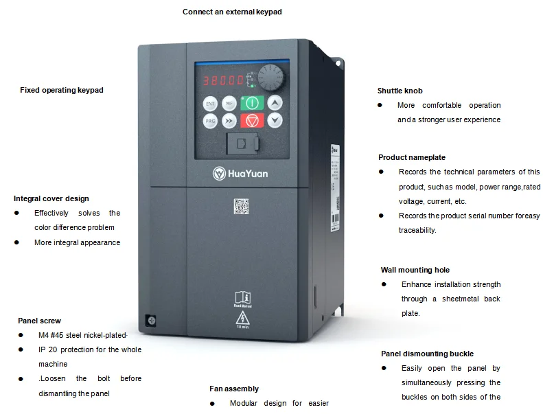 On the basis of inheriting the typical style of G1 series products, the G100 series general open-loop vector inverter is designed with appearance aesthetics and ergonomics in consideration in order to improve itspracticability, usability, and experience feelings, satisfying and even exceeding customers’ expectations.