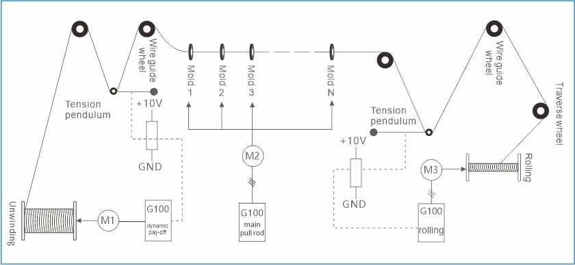 Schematic of a wire drawing machine with variable-frequency control, active paying-off, and constant tension take-up